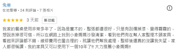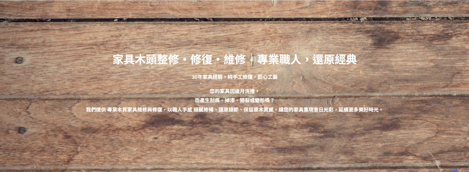 專業的修復服務 我們堅持使用高品質環保木器修復材料,安全無毒,不影響您的生活環境。 木頭表面刮痕、凹痕修復 填補、打磨修復,恢復光滑質感讓家具表面重現如新 掉漆、褪色補色處理 精準調色補漆,修復色差與掉漆還原家具自然色澤 實木家具裂縫修補 填補強化,修復裂縫並穩固結構延長家具使用壽命 客戶的滿意之聲 我們不只是修復家具更是 修復回憶與價值,讓美好延續 修復後的家具看起來就像新的一樣,超出預期! 他們的技術讓我非常放心,結果令我驚喜! 從預約到完成,每一步都非常專業,我會推薦給朋友!’ 簡單的服務流程 我們的服務流程簡潔明瞭讓您輕鬆預約並享受專業服務。 1.預約 透過電話或網站輕鬆預約,專人將與您聯繫確認細節 2.專業整修 安排運送至工坊,師傅精修,恢復家具美觀與耐用度。 3.滿意交付 完成服務後,我們會與您確認,確保您完全滿意。 1.預約 以下是為了能夠滿足段落所需的長度而定義的無意義內文,請自行參酌編排。 1.預約 以下是為了能夠滿足段落所需的長度而定義的無意義內文,請自行參酌編排。 1.預約 以下是為了能夠滿足段落所需的長度而定義的無意義內文,請自行參酌編排。 修復前 修復後 修復前 修復後 修復前 修復後 專業的家具維修服務 立即預約|專業木頭家具修復不用換新,讓您的家具 再現經典,重拾價值!📞 聯絡我們:[加入官方LINE / 撥打服務電話] 立即諮詢